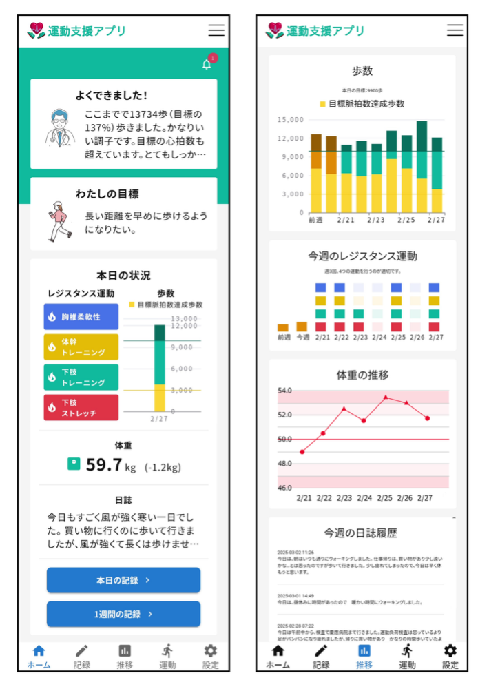 もうひとつは、アプリを用いた遠隔での運動支援サービスです。Fitbitという時計型ウェアラブル機器で脈拍・歩数を常時把握できるようにし、当院が開発支援したアプリ(すこナビ:慶應義塾大学スポーツ医学総合センターが慶應初スタートアップの株式会社グレースイメージングと共同して開発)を通じて毎日の運動を支援します。このアプリは、医師主導治験を実施した運動支援基盤に基づいており、心不全患者さんの心肺機能や運動能力(例:最高酸素摂取量、握力、膝伸展筋力)に有意な改善が認められています。定期的に医療者からフィードバックを受けながら、有酸素運動とレジスタンストレーニング(筋力トレーニング:注1)による継続支援が可能です。
