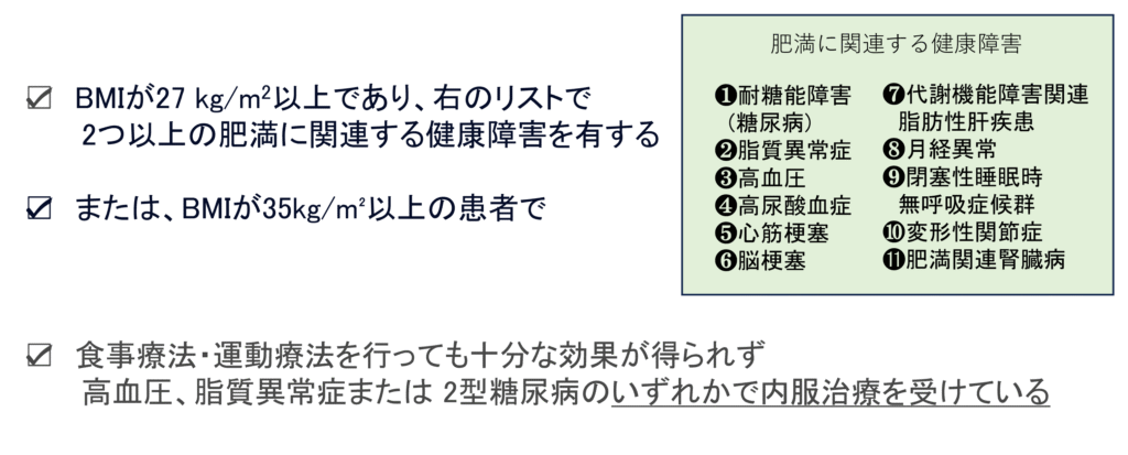 肥満症の治療薬の開発に関しては、過去にも多くの挑戦がされてきましたが、副作用や効果が不十分で、高い効用をもって使用できる薬がない時代が続いてきました。近年、糖尿病診療においてセマグルチド(商品名:オゼンピック®)とチルゼパチド(商品名:マンジャロ®)が、体重減少作用を有する血糖降下薬として広く使用されるようになってきた背景の中で、過体重や肥満の成人が参加したSTEP臨床試験プログラムの結果に基づき、2023年に肥満症を適応症としたGLP-1受容体作動薬セマグルチド(ウゴービ®)が承認され、2024年2月に発売されました。ウゴービ®は、空腹感を軽減し満腹感を高めて食事量を減らし、カロリー摂取を抑え体重減少を促す週1回の皮下注射製剤です。2024年12月には持続性GIP/GLP-1受容体作動薬であるチルゼパチド(ゼップバウンド®)がSURMOUNT臨床試験に基づき、肥満症を適応として承認され、2025年4月発売されました。ゼップバウンド®は中枢神経系におけるGIP、GLP-1受容体を介した食欲調節と脂肪細胞におけるGIP受容体を介した脂肪分解亢進による体重減少作用を有する週1回の皮下注射製剤です。臨床試験「SURMOUNT-5試験」では、2型糖尿病を有さない肥満の成人751人を対象に、ウゴービ®とゼップバウンド®の減量効果が確認されています。治療期間は72週間で、両薬剤を最大推奨用量(ウゴービ®2.4mg、ゼップバウンド®15mg)で週1回投与したところ、体重変化率はウゴービ®群で体重の13.7%(約15.0 kg)、ゼップバウンド®群で体重の20.2%(約22.8 kg)減少し、両者の薬剤の有効性が確かめられています。どちらの薬剤にするかは、個々の患者さんへの相性を見極めながら、消化器症状などの有害事象にも考慮して選択します。薬物に依存せずライフスタイルの適正化に取り組みやすい方の薬剤選択を行うことが大切です。ウゴービ®とゼップバウンド®はどこでもだれでもダイエット目的で使用できるわけではありません。当院はこれらの薬を使用することが承認されている医療機関ですが、使用できる肥満症の要件が厳格に決められています。図6に肥満症治療薬の使用要件を示しますが、使用前には必ず主治医に要件にあてはまるか確認するようにしてください。