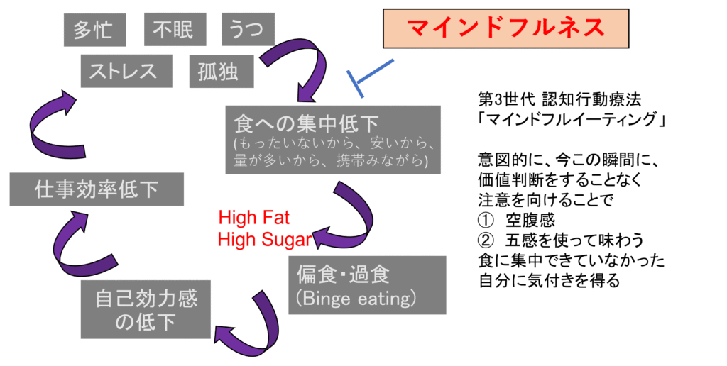 認知行動療法に関して、もう少し深く触れさせてください。肥満症治療における認知行動療法の効果が少しずつ明らかになってきています。マインドフルネスという言葉がありますが、これは過去や未来のことにとらわれず、今の自分に集中しようという精神療法の一つです。ストレスや不眠への効果が知られていますが、それを過食や偏食の防止に活かしていこうというのがマインドフルイーティングです。当院では、精神・神経科の専門の医師と連携し、肥満症におけるマインドフル的介入のプログラムを実施しています。マインドフルに食事をとることによって、過度な食事制限によるストレスを避けてリバウンドを防ぐことを目的とする取り組みです。看護相談では、マインドフルイーティングのオリエンテーションとして、習得に役立つ本や動画の紹介を行い、さらに興味のある方には、マインドフルイーティングを専門とする精神・神経科医師の外来や集団教室のご案内などを行っております。興味のある方は、主治医にご相談いただけましたら幸いです。