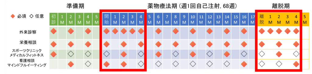 当院では、図6の要件を満たして、肥満症治療が必要な状態の方に、肥満症治療薬を用いた独自の肥満症内科治療プログラムを作り、広くお役立ていただいております。肥満症治療薬の最大の治療期間は、ウゴービ®68週間とゼップバウンド®72週間までとされています。一度中止した後に必要性が認められる場合に再開できますが、肥満症治療薬に依存することなく、食事運動療法、認知行動療法の指導を入念に行い、安全に離脱できる体制を整えることが重要です。当院では、最初に紹介したように、各診療科と多職種で連携して、肥満症治療薬の効果をより強いものとし、リバウンドを防ぐ策を行いながら、図7のプログラム内容に沿って診療を行っています。特に管理栄養士による2か月ごとの栄養相談が必須であること、薬物治療開始前に6か月間の準備期があることは、大切なポイントです。